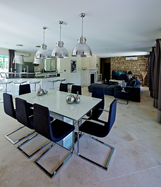 • La pièce de réception revêtue de marbre et agrémentée d’une cheminée de pierre, ouvre sur une magnifique cuisine au design contemporain, dotée d’un équipement  de dernière génération : 3 fours , machine à café intégrée, lave-vaisselle, hotte inox, plaque à induction 5 feux, réfrigérateur américain, robinetterie haut de gamme, et petit électroménager tels que bouilloire, grille-pain….