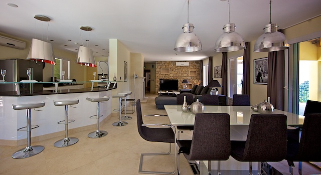 • Séjour avec cuisine ouverte (2 fours multifonction et Micro-onde, lave-vaisselle, plaque à induction, réfrigérateur congélateur).